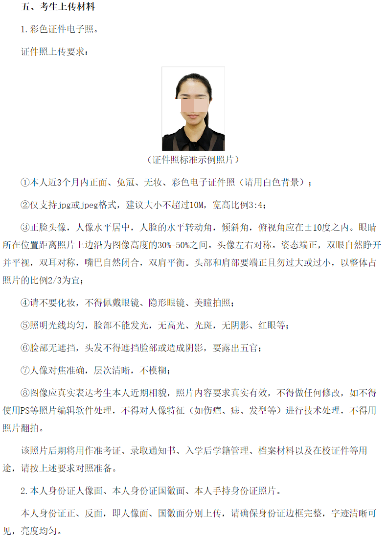1、近期免冠彩色证件照(用于准考证照片)、本人身份证人像面、本人身份证国徽面、本人手持身份证照片(对于居民身份证已经过期或即将过期的,请考生提前补办新的身份证)。