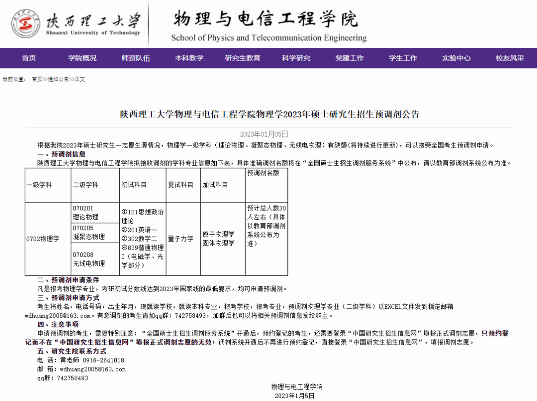 陕西理工大学物理与电信工程学院发布了预调剂公告,其中物理学一级学科(理论物理、凝聚态物理、无线电物理)预计缺额30人左右。