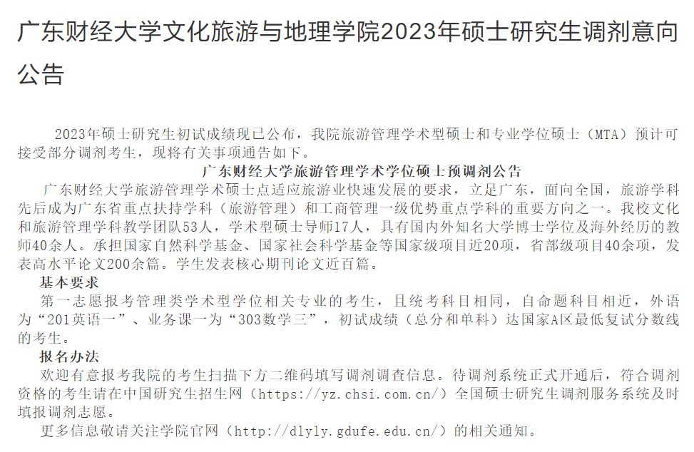 广东财经大学文化旅游与地理学院发布了2023年硕士研究生调剂意向公告,旅游管理学术型硕士和专业学位硕士(MTA)预计可接受部分调剂考生。