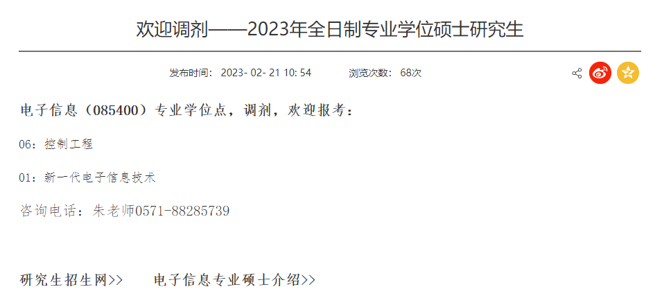 浙大城市学院信息与电气工程学院发布了2023年全日制专业学位硕士研究生,电子信息(085400)专业学位有调剂名额。