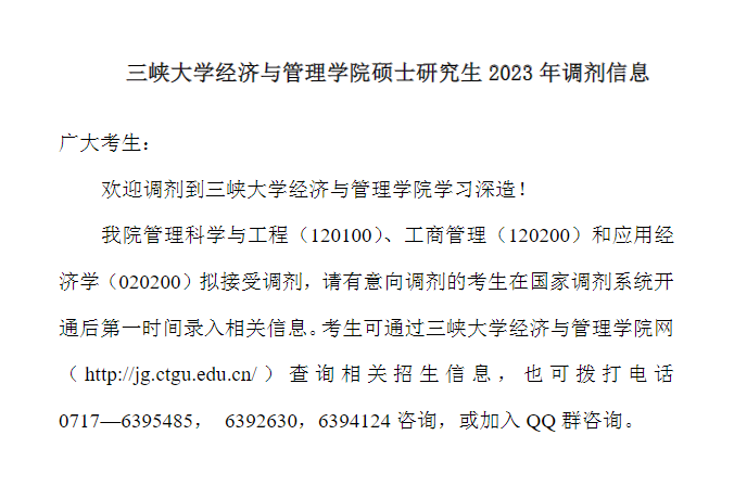 三峡大学经济与管理学院发布了2023年硕士研究生调剂信息,管理科学与工程(120100)、工商管理(120200)和应用经济学(020200)拟接受调剂。