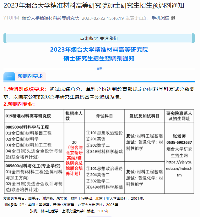 烟台大学发布《2023年烟台大学精准材料高等研究院硕士研究生招生预调剂通知》,要求初试成绩总分、单科分均达到教育部规定的材料学科复试分数。